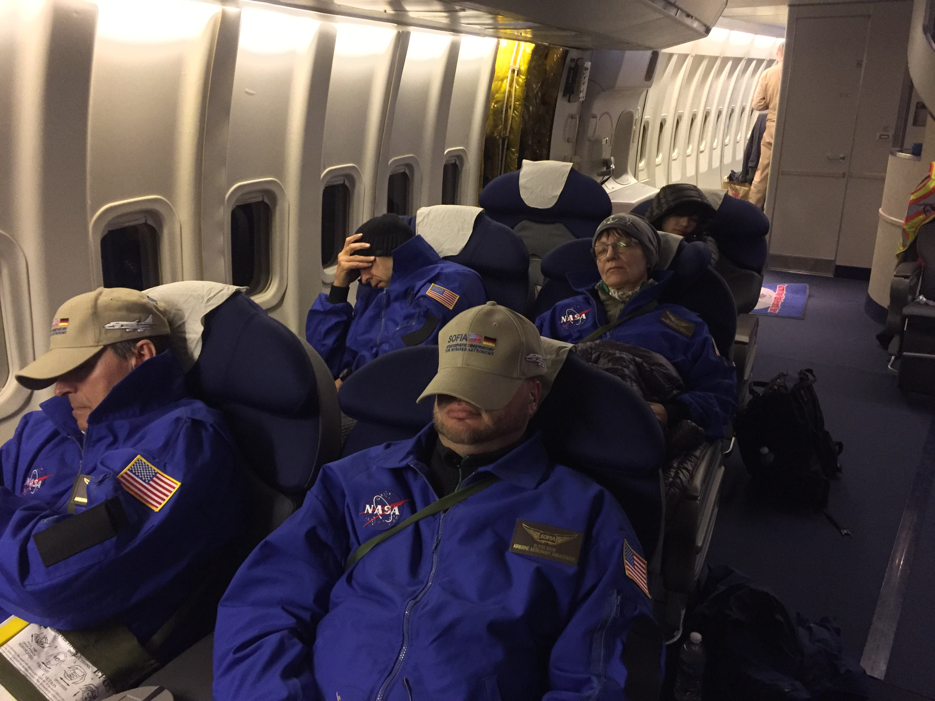 Everybody is exhausted (and cold) towards the end of the ten hour mission (in the middle of the German guests’ biological night), using the business class seats at the front of the cabin to take a nap.