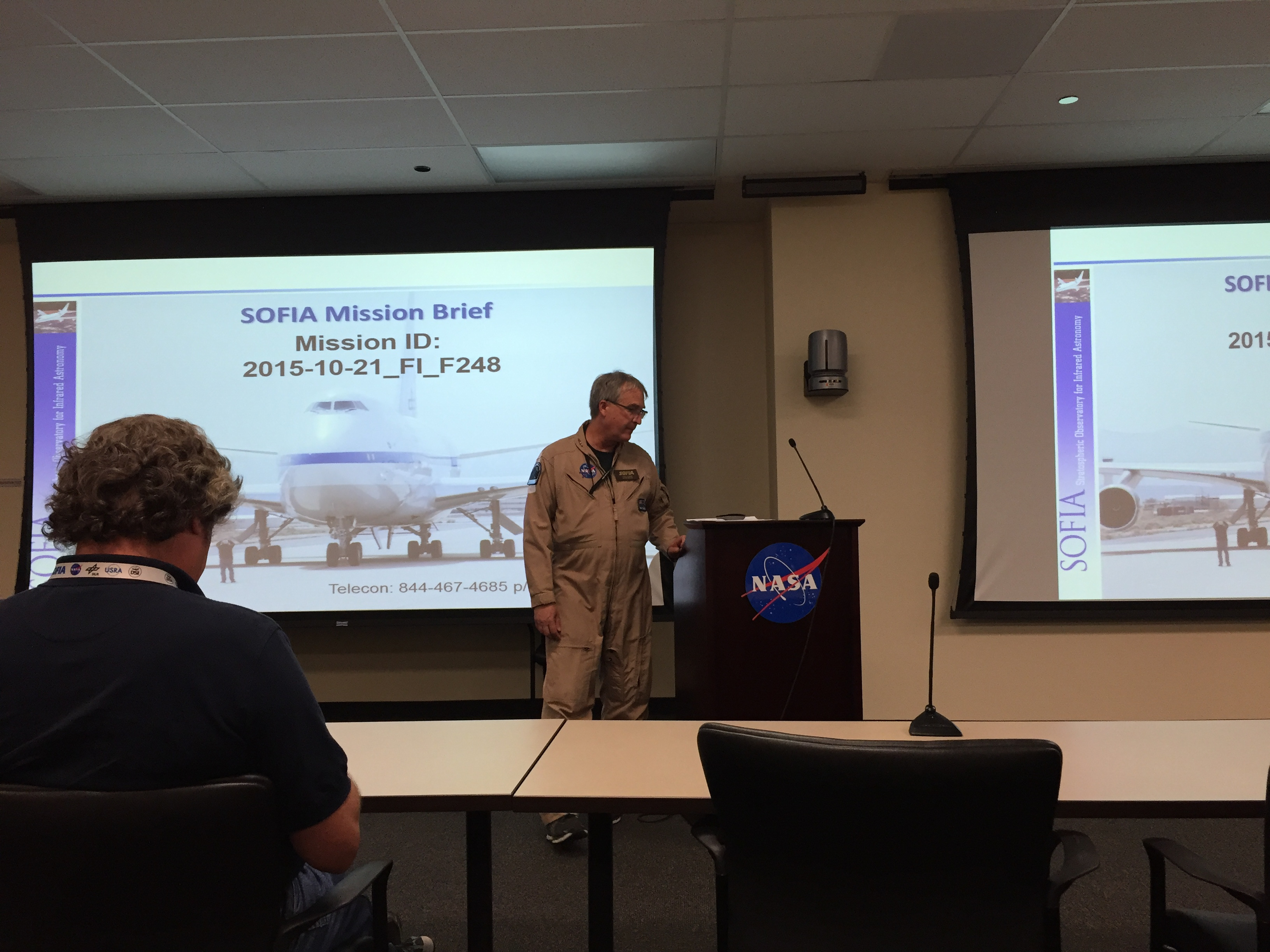Mission director Charlie Kaminski is about to start the mission briefing. Everybody flying on the aircraft attends, and topics include science objective, weather, flight track, as well as the ubiquitous safety notices and the reminders for everybody to take their food out of the fridge at the end of the flight.