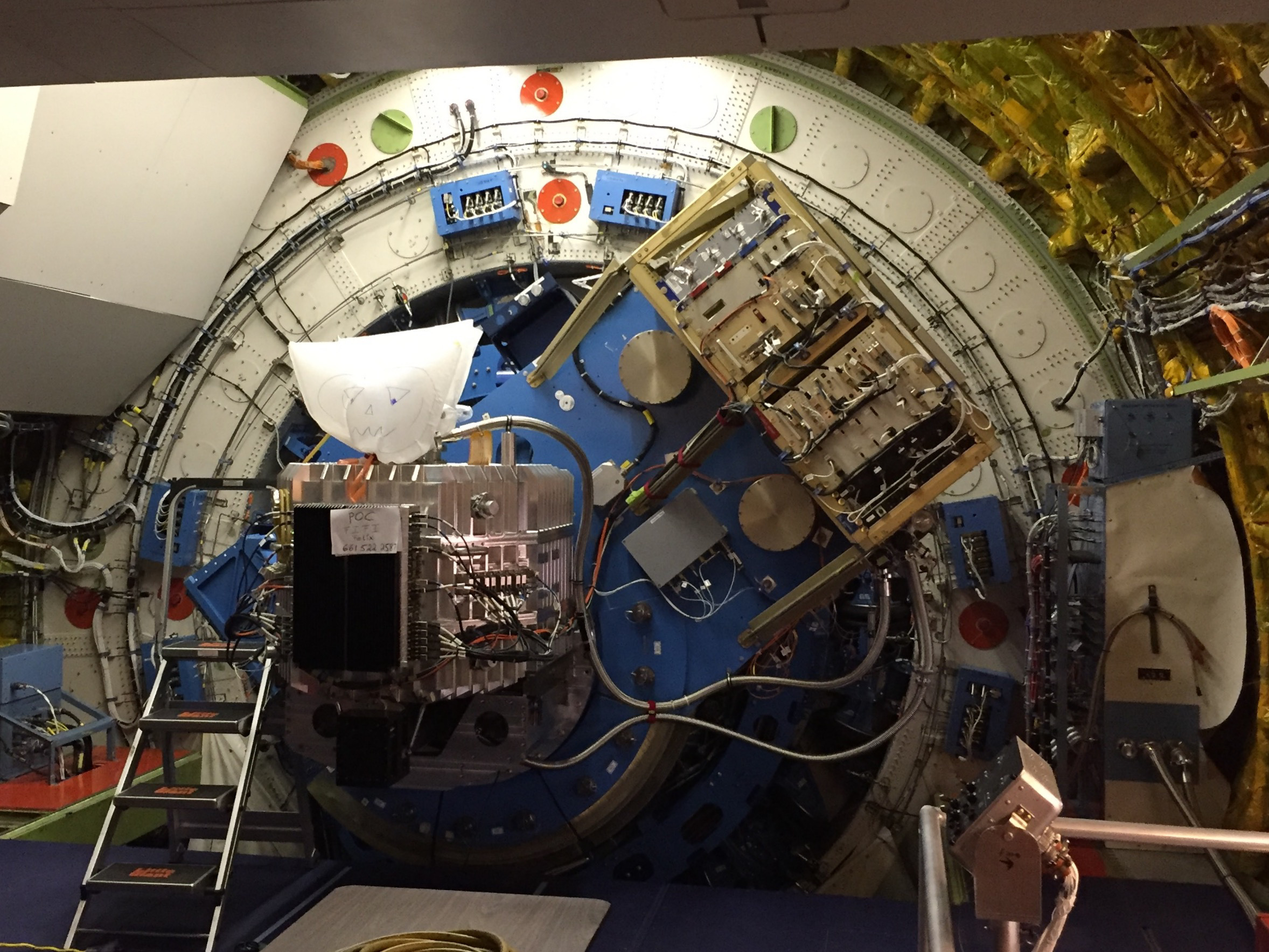 Looking aft towards the telescope. The grey ring is the aft bulkhead in which the telescope is mounted. The blue structure is the telescope and its counterweight. The silver box in the center is the FIFI-LS instrument. The white plastic bag with the face drawn on it located on top of the instrument indicates coolant flow :-) The whole structure, telescope and instrument, moves around inside the bulkhead when the telescope controller is active and the 747 flies through turbulence.