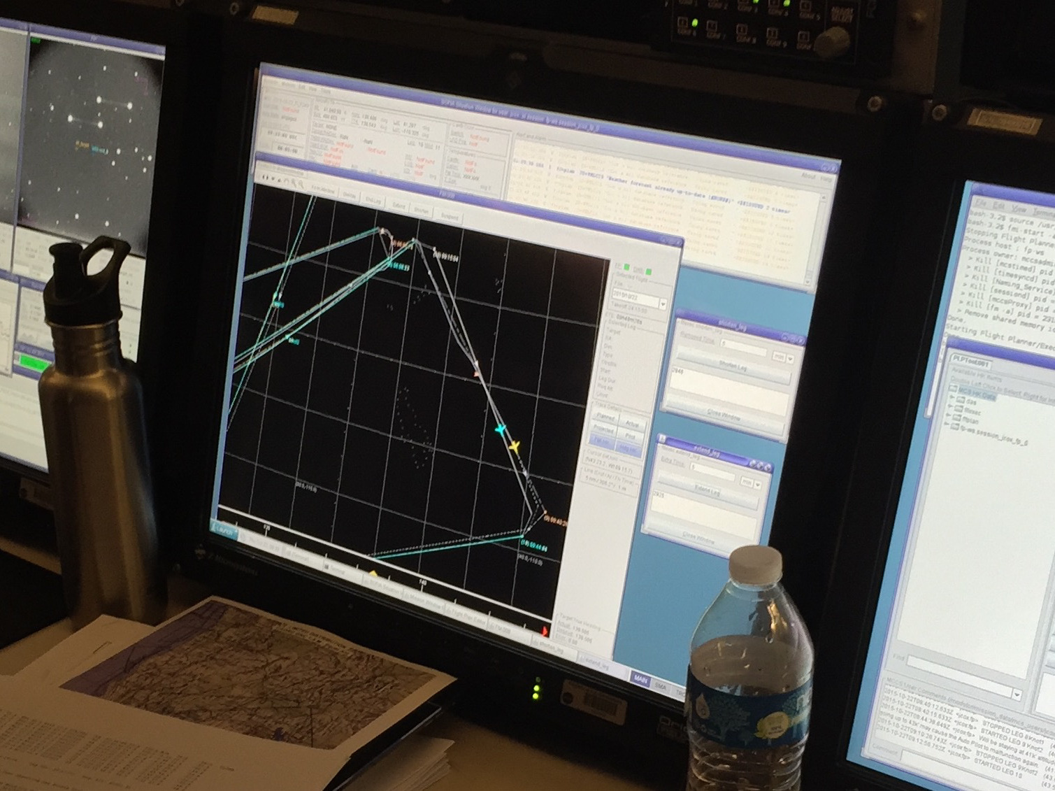 A glimpse on to the flight planner’s display. The screen shows the planned track as well as the actually flown route. The two might diverge because of unexpected winds and the inability to crab (because that would change the heading, which in turn determines the observation target), or because minor adjustments are made to the observation schedule.
